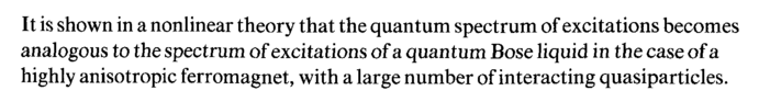 It is shown in a nonlinear theory that the quantum spectrum of excitations becomes analogous to the spectrum of excitations of a quantum Bose liquid in the case of a highly anisotropic ferromagnet, with a large number of interacting quasiparticles.