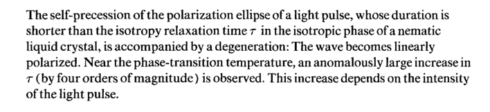 The self-precession of the polarization ellipse of a light pulse, whose duration is shorter than the isotropy relaxation time r in the isotropic phase of a nematic liquid crystal, is accompanied by a degeneration: The wave becomes linearly polarized. Near the phase-transition temperature, an anomalously large increase in r (by four orders of magnitude) is observed. This increase depends on the intensity of the light pulse.