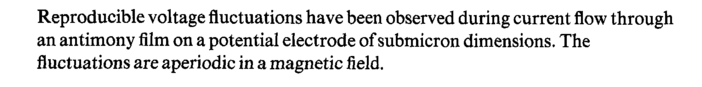 Reproducible voltage fluctuations have been observed during current flow through an antimony film on a potential electrode of submicron dimensions. The fluctuations are aperiodic in a magnetic field.