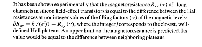 It has been shown experimentally that the magnetoresistance Rxx (ν) of long channels in silicon field-effect transistors is equal to the difference between the Hall resistances at noninteger values of the filling factors (v) of the magnetic levels: SRxy = h /(e2j) — Rxy (ν), where the integer у corresponds to the closest, well-defined Hall plateau. An upper limit on the magnetoresistance is predicted. Its value would be equal to the difference between neighboring plateaus.