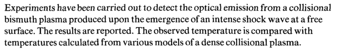 Experiments have been carried out to detect the optical emission from a collisional bismuth plasma produced upon the emergence of an intense shock wave at a free surface. The results are reported. The observed temperature is compared with temperatures calculated from various models of a dense collisional plasma.