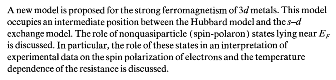 A new model is proposed for the strong ferromagnetism of 3d metals. This model occupies an intermediate position between the Hubbard model and the s-d exchange model. The role of nonquasiparticle (spin-polaron) states lying near EF is discussed. In particular, the role of these states in an interpretation of experimental data on the spin polarization of electrons and the temperature dependence of the resistance is discussed.