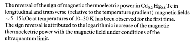 The reversal of the sign of magnetic thermoelectric power in Cd0 2 Hg0 8 Те in longitudinal and transverse (relative to the temperature gradient) magnetic fields — 5-15 kOe at temperatures of 10-30 К has been observed for the first time. The sign reversal is attributed to the logarithmic increase of the magnetic thermoelectric power with the magnetic field under conditions of the ultraquantum limit.