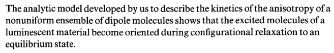 The analytic model developed by us to describe the kinetics of the anisotropy of a nonuniform ensemble of dipole molecules shows that the excited molecules of a luminescent material become oriented during configurational relaxation to an equilibrium state.