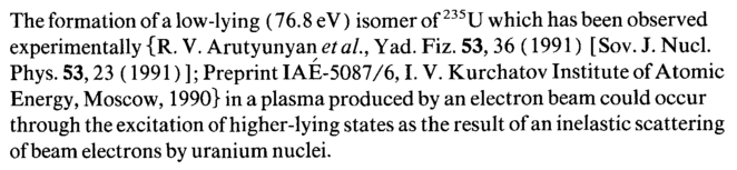 The formation of a low-lying (76.8 eV) isomer of 235U which has been observed experimentally {R. V. Arutyunyan etal, Yad. Fiz. 53,36 (1991) [Sov. J. Nucl. Phys. 53,23 (1991)]; Preprint IAE-5087/6,1. V. Kurchatov Institute of Atomic Energy, Moscow, 1990} in a plasma produced by an electron beam could occur through the excitation of higher-lying states as the result of an inelastic scattering of beam electrons by uranium nuclei.