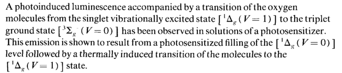 A photoinduced luminescence accompanied by a transition of the oxygen molecules from the singlet vibrationally excited state [lAg(V=l)]to the triplet ground state [ 32й" ( V = 0) ] has been observed in solutions of a photosensitizer. This emission is shown to result from a photosensitized filling of the [ 'Δ^ ( V = 0) ] level followed by a thermally induced transition of the molecules to the [l\(V= 1)] state.