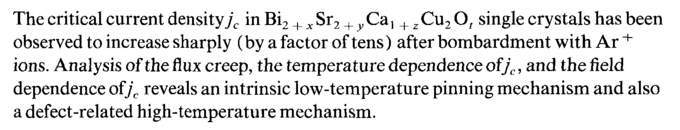 The critical current densityjc in Bi2 + x Sr2 + yCax + 2Cu2 Ot single crystals has been observed to increase sharply (by a factor of tens) after bombardment with Ar + ions. Analysis of the flux creep, the temperature dependence of jc, and the field dependence of jc reveals an intrinsic low-temperature pinning mechanism and also a defect-related high-temperature mechanism.