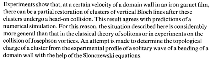 Experiments show that, at a certain velocity of a domain wall in an iron garnet film, there can be a partial restoration of clusters of vertical Bloch lines after these clusters undergo a head-on collision. This result agrees with predictions of a numerical simulation. For this reason, the situation described here is considerably more general than that in the classical theory of solitons or in experiments on the collision of Josephson vortices. An attempt is made to determine the topological charge of a cluster from the experimental profile of a solitary wave of a bending of a domain wall with the help of the Slonczewski equations.