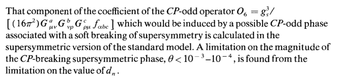 That component of the coefficient of the CP-odd operator 06 = g\/ [ (1 бтг2 JGJvGj (?ρμ fahc ] which would be induced by a possible CP-odd phase associated with a soft breaking of supersymmetry is calculated in the supersymmetric version of the standard model. A limitation on the magnitude of the CP-breaking supersymmetric phase, 0 < 10 ~3 -10 ~ 4, is found from the limitation on the value of dn.