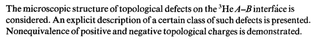 The microscopic structure of topological defects on the 3НеЛ-В interface is considered. An explicit description of a certain class of such defects is presented. Nonequi valence of positive and negative topological charges is demonstrated.