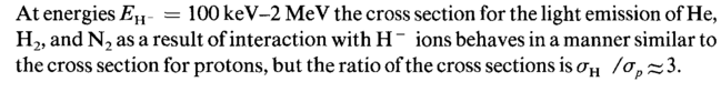 At energies EH=100 keV-2 MeV the cross section for the light emission of He, H2, and N2 as a result of interaction with Η ~ ions behaves in a manner similar to the cross section for protons, but the ratio of the cross sections is σΗ /σρ~3.