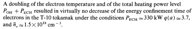 A doubling of the electron temperature and of the total heating power level POH + òåÓÎ resulted in virtually no decrease of the energy confinement time of electrons in the T-10 tokamak under the conditions òåóÎ — 330 kWg(a)^3J, and «e~1.5xl018cm~3.