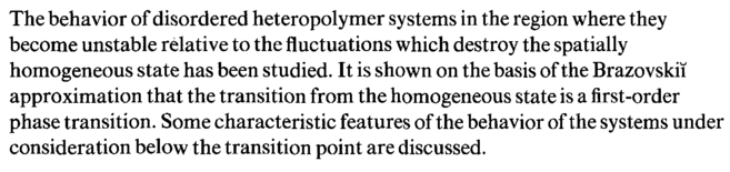 The behavior of disordered heteropolymer systems in the region where they become unstable relative to the fluctuations which destroy the spatially homogeneous state has been studied. It is shown on the basis of the Brazovskii approximation that the transition from the homogeneous state is a first-order phase transition. Some characteristic features of the behavior of the systems under consideration below the transition point are discussed.