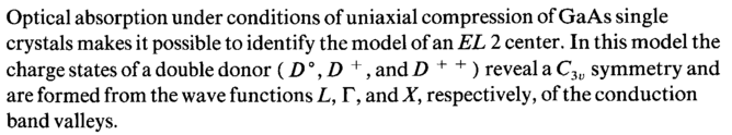 Optical absorption under conditions of uniaxial compression of GaAs single crystals makes it possible to identify the model of an EL 2 center. In this model the charge states of a double donor (D°,D +, and D + + ) reveal a C3v symmetry and are formed from the wave functions L, Г, and X, respectively, of the conduction band valleys.