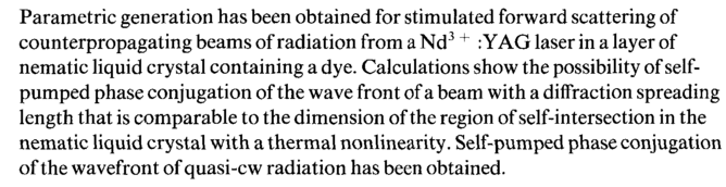 Parametric generation has been obtained for stimulated forward scattering of counterpropagating beams of radiation from a Nd3 + : YAG laser in a layer of nematic liquid crystal containing a dye. Calculations show the possibility of self-pumped phase conjugation of the wave front of a beam with a diffraction spreading length that is comparable to the dimension of the region of self-intersection in the nematic liquid crystal with a thermal nonlinearity. Self-pumped phase conjugation of the wavefront of quasi-cw radiation has been obtained.