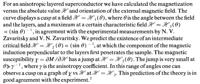 For an anisotropic layered superconductor we have calculated the magnetization versus the absolute value ö and orientation of the external magnetic field. The curve displays a cusp at a field ö = öÈ (θ), where θ is the angle between the field and the layers, and a maximum at a certain characteristic field ö = ö3 (θ) ÏÓ (sin θ) ~ 1, in agreement with the experimental measurements by Ν. V. Zavaritsky and V. N. Zavaritsky. We predict the existence of an intermediate critical field ö = ö2 (θ) <χ (sin θ) ~ ', at which the component of the magnetic induction perpendicular to the layers first penetrates the sample. The magnetic susceptibility j = Äí /Äö has a jump ßè,ö = ö2{9). The jump is very small at 6?> γ ~1, where ^is the anisotropy coefficient. In this range of angles one can observe a cusp on a graph of χ vs^at ö = ö2. This prediction of the theory is in good agreement with the experiment.2