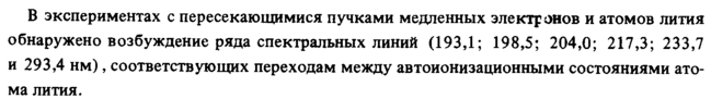 В экспериментах с пересекающимися пучками медленных электронов и атомов лития обнаружено возбуждение ряда спектральных линий (193,1; 198,5; 204,0; 217,3; 233,7 и 293,4 нм), соответствующих переходам между автоионизационными состояниями атома лития.