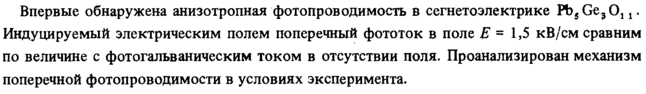 Впервые обнаружена анизотропная фотопроводимость в сегнетоэлектрике Pb5Ge30j t. Индуцируемый электрическим полем поперечный фототок в поле Ε 1,5 кВ/см сравним по величине с фотогальваническим током в отсутствии поля. Проанализирован механизм поперечной фотопроводимости в условиях эксперимента.