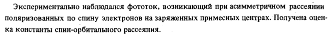 Экспериментально наблюдался фототок, возникающий при асимметричном рассеянии поляризованных по спину электронов на заряженных примесных центрах. Получена оценка константы спин-орбитального рассеяния.