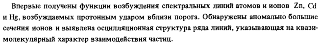 Впервые получены функции возбуждения спектральных линий атомов и ионов Zn, Cd и Hg, возбуждаемых протонным ударом вблизи порога. Обнаружены аномально большие сечения ионов и выявлена осцилляционная структура ряда линий, указывающая на квазимолекулярный характер взаимодействия частиц.