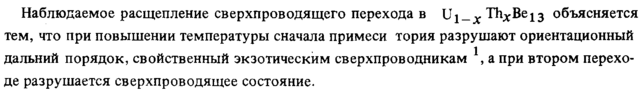 Наблюдаемое расщепление сверхпроводящего перехода в Uj_x ThxBe13 объясняется тем, что при повышении температуры сначала примеси тория разрушают ориентационный дальний порядок, свойственный экзотическим сверхпроводникам , а при втором переходе разрушается сверхпроводящее состояние.
