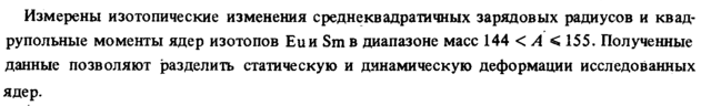 Измерены изотопические изменения среднеквадратичных зарядовых радиусов и квад-рупольные моменты ядер изотопов Еии Smв диапазоне масс 144 < А < 155. Полученные данные позволяют разделить статическую и динамическую деформации исследованных ядер.