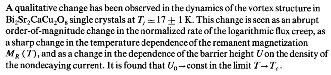 A qualitative change has been observed in the dynamics of the vortex structure in Bi2Sr2CaCu208 single crystals at 7} ~ 17 + IK. This change is seen as an abrupt order-of-magnitude change in the normalized rate of the logarithmic flux creep, as a sharp change in the temperature dependence of the remanent magnetization MR (Τ), and as a change in the dependence of the barrier height U on the density of the nondecaying current. It is found that U0 -> const in the limit Γ-> Tc.