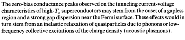 The zero-bias conductance peaks observed on the tunneling current-voltage characteristics of highTc superconductors may stem from the onset of a gapless region and a strong gap dispersion near the Fermi surface. These effects would in turn stem from an inelastic relaxation of quasiparticles due to phonons or low-frequency collective excitations of the charge density (acoustic plasmons).