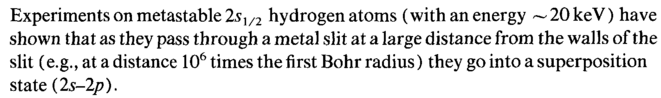Experiments on metastable 2s,/2 hydrogen atoms (with an energy — 20keV) have shown that as they pass through a metal slit at a large distance from the walls of the slit (e.g., at a distance 106 times the first Bohr radius) they go into a superposition state (2s-2p).