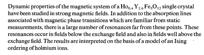 Dynamic properties of the magnetic system of a Ho0 4 Y2.e FesO 12 single crystal have been studied in strong magnetic fields. In addition to the absorption lines associated with magnetic phase transitions which are familiar from static measurements, there is a large number of resonances far from these points. These resonances occur in fields below the exchange field and also in fields well above the exchange field. The results are interpreted on the basis of a model of an Ising ordering of holmium ions.