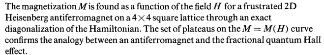 The magnetization Mis found as a function of the field Η for a frustrated 2D Heisenberg antiferromagnet on a 4 X 4 square lattice through an exact diagonalization of the Hamiltonian. The set of plateaus on the Μ = Μ (Η) curve confirms the analogy between an antiferromagnet and the fractional quantum Hall effect.