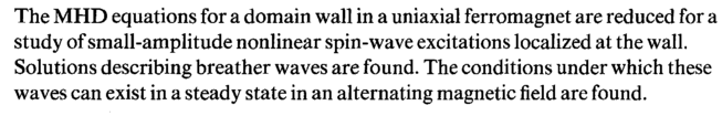 The MHD equations for a domain wall in a uniaxial ferromagnet are reduced for a study of small-amplitude nonlinear spin-wave excitations localized at the wall. Solutions describing breather waves are found. The conditions under which these waves can exist in a steady state in an alternating magnetic field are found.
