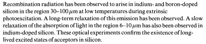 Recombination radiation has been observed to arise in indiumand boron-doped silicon in the region 30-100 //m at low temperatures during extrinsic photoexcitation. A long-term relaxation of this emission has been observed. A slow relaxation of the absorption of light in the region 6-10//m has also been observed in indium-doped silicon. These optical experiments confirm the existence of long-lived excited states of acceptors in silicon.