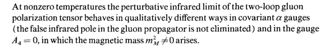 At nonzero temperatures the perturbative infrared limit of the two-loop gluon polarization tensor behaves in qualitatively different ways in covariant a gauges (the false infrared pole in the gluon propagator is not eliminated) and in the gauge A4 = 0, in which the magnetic mass m2M φ 0 arises.