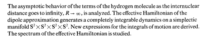The asymptotic behavior of the terms of the hydrogen molecule as the internuclear distance goes to infinity, R -» oo, is analyzed. The effective Hamiltonian of the dipole approximation generates a completely integrable dynamics on a simplectic manifold S2 X S2 X S2 X S2. New expressions for the integrals of motion are derived. The spectrum of the effective Hamiltonian is studied.