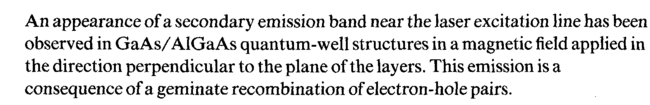 An appearance of a secondary emission band near the laser excitation line has been observed in GaAs/AlGaAs quantum-well structures in a magnetic field applied in the direction perpendicular to the plane of the layers. This emission is a consequence of a geminate recombination of electron-hole pairs.