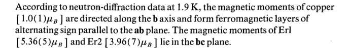 According to neutron-diffraction data at 1.9 K, the magnetic moments of copper [1.0(1 )μΒ ] are directed along the b axis and form ferromagnetic layers of alternating sign parallel to the ab plane. The magnetic moments of Erl [536(5)μβ] andEr2 [3.96(1)μΒ] lie in the be plane.