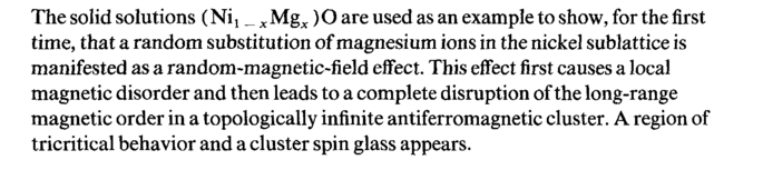 The solid solutions (Nix _ xMgx)О are used as an example to show, for the first time, that a random substitution of magnesium ions in the nickel sublattice is manifested as a random-magnetic-field effect. This effect first causes a local magnetic disorder and then leads to a complete disruption of the long-range magnetic order in a topologically infinite antiferromagnetic cluster. A region of tricritical behavior and a cluster spin glass appears.