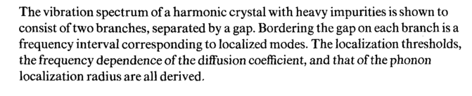 The vibration spectrum of a harmonic crystal with heavy impurities is shown to consist of two branches, separated by a gap. Bordering the gap on each branch is a frequency interval corresponding to localized modes. The localization thresholds, the frequency dependence of the diffusion coefficient, and that of the phonon localization radius are all derived.