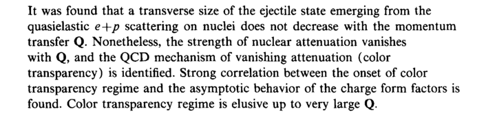 It was found that a transverse size of the ejectile state emerging from the quasielastic e+p scattering on nuclei does not decrease with the momentum transfer Q. Nonetheless, the strength of nuclear attenuation vanishes with Q, and the QCD mechanism of vanishing attenuation (color transparency) is identified. Strong correlation between the onset of color transparency regime and the asymptotic behavior of the charge form factors is found. Color transparency regime is elusive up to very large Q.