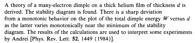 A theory of a many-electron dimple on a thick helium film of thickness d is derived. The stability diagram is found. There is a sharp deviation from a monotonic behavior on the plot of the total dimple energy W versus d as the latter varies monotonically near the minimum of the stability diagram. The results of the calculations are used to interpret some experiments by Andrei [Phys. Rev. Lett. 52, 1449 (1984)].