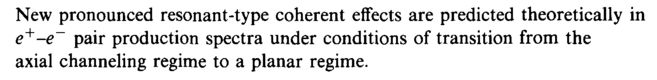 New pronounced resonant-type coherent effects are predicted theoretically in e+-e~ pair production spectra under conditions of transition from the axial channeling regime to a planar regime.
