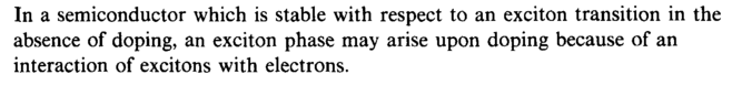 In a semiconductor which is stable with respect to an exciton transition in the absence of doping, an exciton phase may arise upon doping because of an interaction of excitons with electrons.
