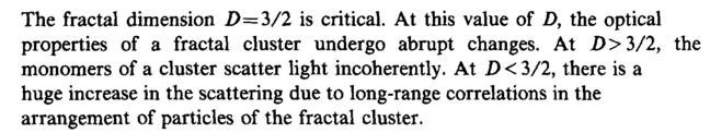 The fractal dimension D=3/2 is critical. At this value of D, the optical properties of a fractal cluster undergo abrupt changes. At 2>>3/2, the monomers of a cluster scatter light incoherently. At D< 3/2, there is a huge increase in the scattering due to long-range correlations in the arrangement of particles of the fractal cluster.