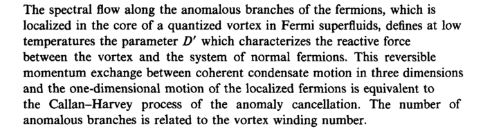 The spectral flow along the anomalous branches of the fermions, which is localized in the core of a quantized vortex in Fermi superfluids, defines at low temperatures the parameter Df which characterizes the reactive force between the vortex and the system of normal fermions. This reversible momentum exchange between coherent condensate motion in three dimensions and the one-dimensional motion of the localized fermions is equivalent to the Callan-Harvey process of the anomaly cancellation. The number of anomalous branches is related to the vortex winding number.