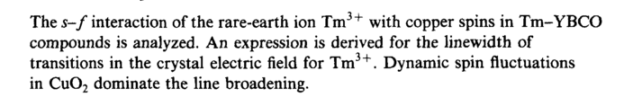 The sf interaction of the rare-earth ion Tm + with copper spins in Tm-YBCO compounds is analyzed. An expression is derived for the linewidth of transitions in the crystal electric field for Tm3+. Dynamic spin fluctuations in Cu02 dominate the line broadening.