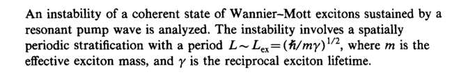 An instability of a coherent state of Wannier-Mott excitons sustained by a resonant pump wave is analyzed. The instability involves a spatially periodic stratification with a period L~Lex= (¥i/my)xn, where m is the effective exciton mass, and γ is the reciprocal exciton lifetime.