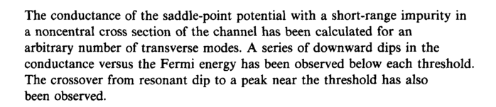 The conductance of the saddle-point potential with a short-range impurity in a noncentral cross section of the channel has been calculated for an arbitrary number of transverse modes. A series of downward dips in the conductance versus the Fermi energy has been observed below each threshold. The crossover from resonant dip to a peak near the threshold has also been observed.