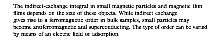 The indirect-exchange integral in small magnetic particles and magnetic thin films depends on the size of these objects. While indirect exchange gives rise to a ferromagnetic order in bulk samples, small particles may become antiferromagnetic and superconducting. The type of order can be varied by means of an electric field or adsorption.