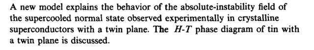 A new model explains the behavior of the absolute-instability field of the supercooled normal state observed experimentally in crystalline superconductors with a twin plane. The H-T phase diagram of tin with a twin plane is discussed.
